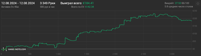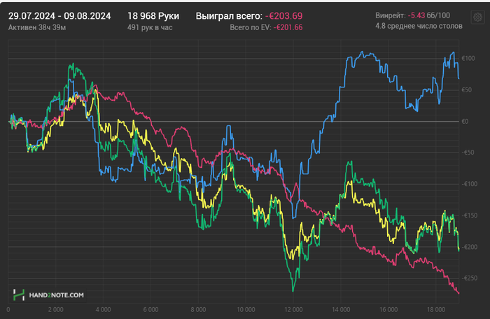 Коины перестали тащиться, доезды на ривере + не складывалось и в 3бет потах с регами. Следующие 8к рук привыкал к статам и решил не качать дисперсию чуть сменив страту на менее агрессивную. Не знаю, может это и не лучшее решение, но в стрике в голову лезут разные мысли. К 12к рукам сессии начал играть в 6 столов и отключил трекер, т.к. понял что дополнительного эджа из статов не могу извлечь, и зачастую сделав выводы по оппу упираюсь в натс на ШД + загромождение экрана доп. инфой стали дико отвлекать. Как результат после отключения трекера начал ворачивать залитое, но потом снова череда неудачных сессий.
