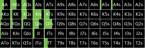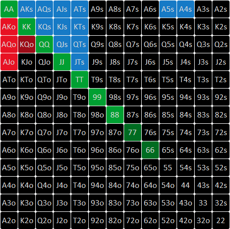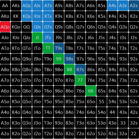 В рейз уходят AA,KK,QQ,TT,AJ разбавленные блефами A5s, A4s,AQs,AQo с разным весом.