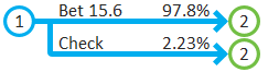 Выбрал чек. Солвер так же выбирает линию от чека в 55.4% случаев со всем диапазоном, а вот линию оппа играет от бета 18,5 только . Все остальные JTs он играет от чека.