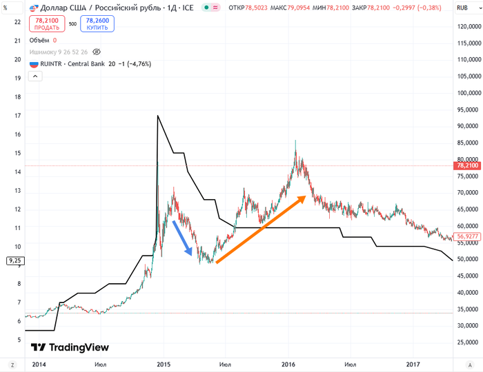 Текущая ситуация имхо с натяжкой похожа на 2015 год, вот график под спойлером, чёрная линия ставка ЦБ, синяя стрелка +-этап охлаждения похожий на тот в котором находимся сейчас и оранжевая стрелка - то что предстоит когда (и если) снежный ком начнёт катиться в другую сторону: