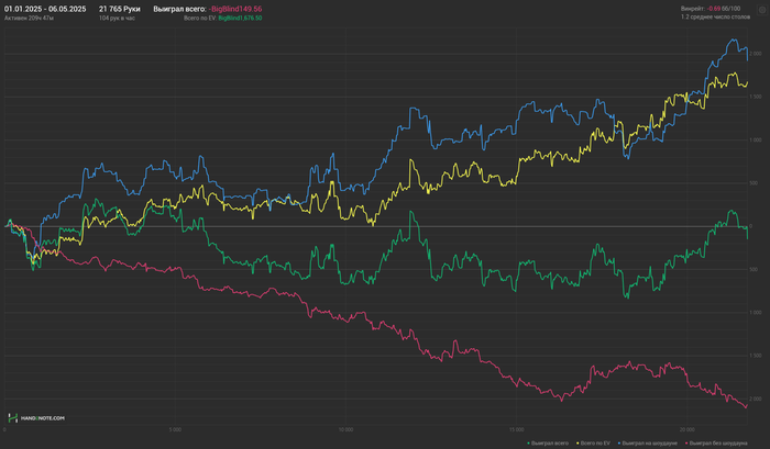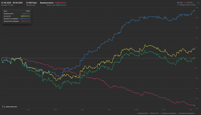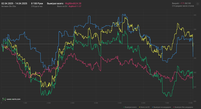 График чисто для наглядности, т.к. на нем не учитывается рейк с некоторых приложений + потеряны часть рук с ББ, бомбпотов, 2-3 круток, а также с приложений без статистики. Лимиты nl50-150. Подключил верхний, так график х2н сразу лег поспать.