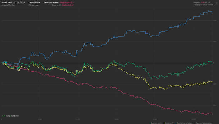 График чисто для наглядности, т.к. на нем не учитывается рейк с некоторых приложений + потеряны часть рук с ББ, бомбпотов, 2-3 круток, а также с приложений без статистики. Играл весь месяц нл40-нл70, только последние пару дней месяца сделал пару вылазок на нл80+.