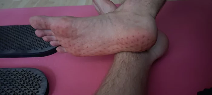 Момент схождения с гвоздей. Проделывать нужно без спешки. Также нагнитесь к полу и переместите давление тела с ног на руки. Медленно приподнимите ногу с гвоздей и переставьте ее на пол, затем тоже самое с другой. Не спешите сразу куда-то идти, т.к. это будет больно. Сядьте и дайте ступням немного отдохнуть, можно их помассировать или растереть, помыть под душем. Для себя заметил, что больнее было сходить до 10 минуты, чем когда стоял 15.