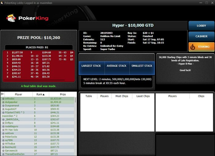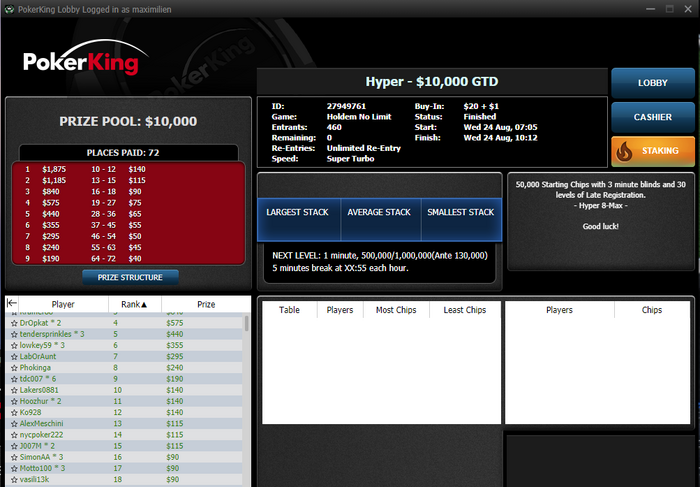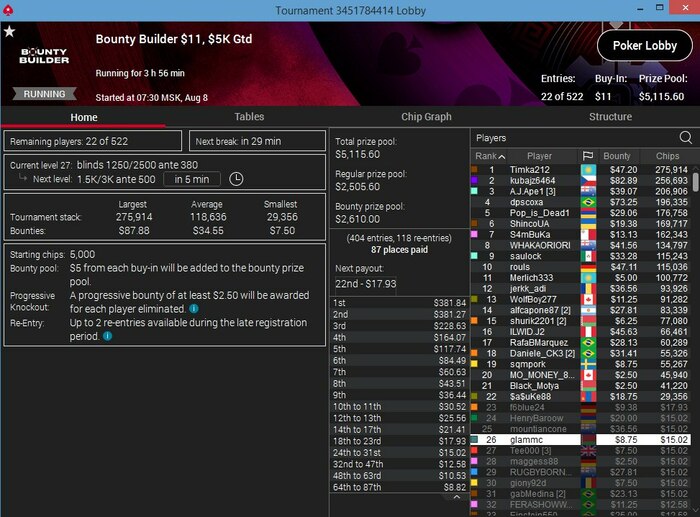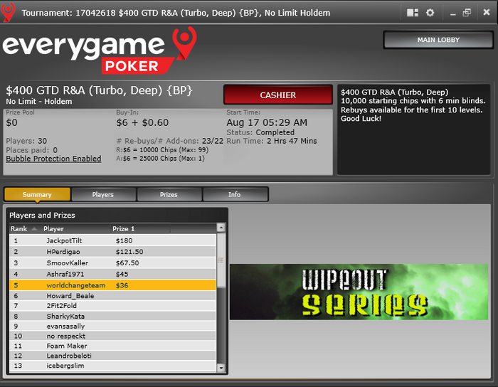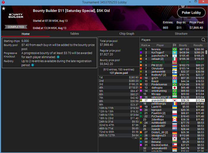 Вернулся из отпуска и сделал несколько хороших результатов) Самый лучший был сегодня в лучшем турнире утра по $/час)