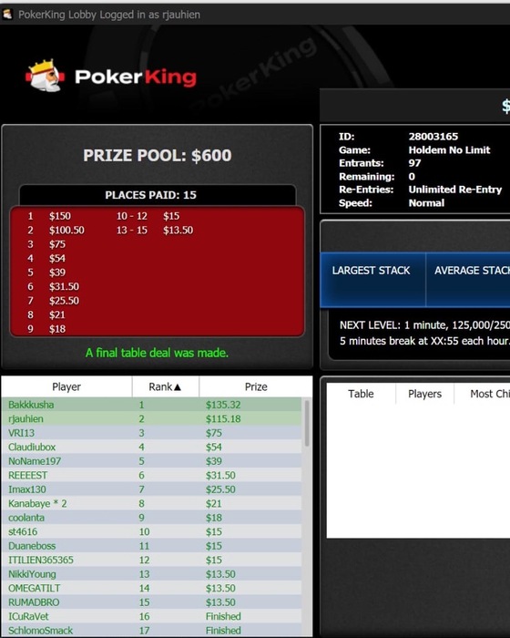 Плодотворные были дни, вчера Кинг завис во время дипа на стриме, было очень неприятно, хорошо отыграл выбросив ТТ на предфиналке, когда был 4м стеком, против стека больше. Вчера ещё проверил, сколько начислили, написал им в поддержку, ведь начислили как за 9е место и сегодня утром смотрю на балансе приятное пополнение) Вчера ещё была финалка неплохого турнира, так что кому интересно - можно глянуть стрим, он в двух частях) Вот ссылка на первую: