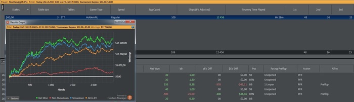 Дисциплина: 5. Отыграл как положено, следил за качеством и настроем. Качество: 5. По идее все обоснованно было. Тильтоустойчивость: 5. Были моменты для того, чтобы начать подтильтовывать, но нет, логикой тушил быстро и продолжал играть хорошо. Диспа: 3. Было с чем играть, но кулерило в минус. Настрой: Хороший, боевой, интересно играть, и смотреть за игрой, и думать какие варианты для розыгрыша. Порадовало отношение к ошибки - сыграл не по стратегии из-за страха, в итоге банк не выйграл, который был бы мой, если бы сыграл по своей страте. Но нисколько не растроился после этого, так как понял, что страта четко-правильная, и это важнее, чем то, что я ошибся. При плохом настрое после такого, можно начать подтильтовывать - по типу "недовольства собой", но нет, четко перевернул в нужную сторону.