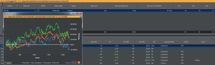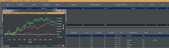 Дисциплина: 5. отыграл как положено, старался внести корректировки в тильтоустойчивость вовремя. Качество: 4. В целом все хорошо делал, но были старые ошибки. Тильтоустойчивость: 3-. Всю сессию по немногу копилось в итоге тильтанул. Из-за не верных ожиданий на сессию. Первопричина - качественная игра для нас должна быть. Диспа: 3. Терпильная, хотя и было с чем играть. Настрой: В целом с интересом играл, пока не увидел, что ожидания ложные не оправдались и тильта поймал. И минус мораль за одно :). Но надеюсь на лучшее, полистал блог - да и на 30 лимите, часто ЕВ в нуле кружило по сессиям, хотя в итоге 59.99 chipEV на 19к, это подбодрило.