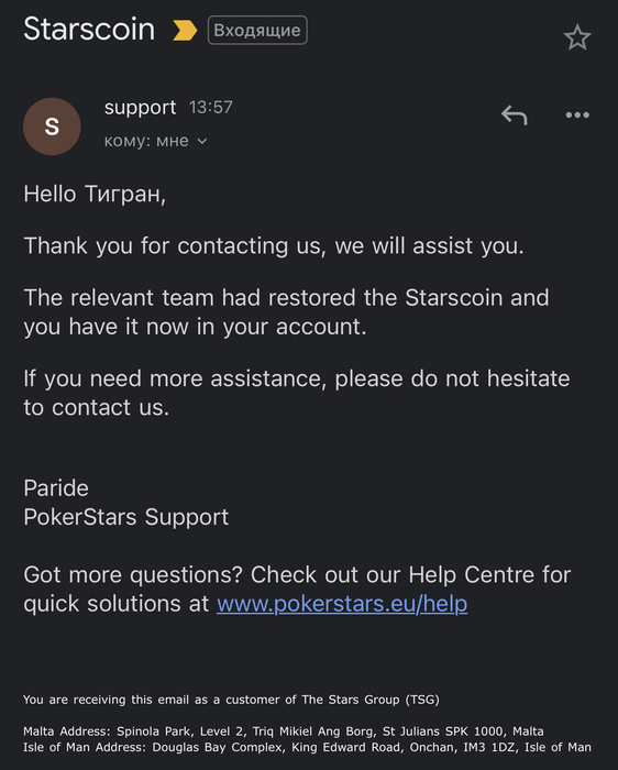 С сообщения от IBAS о том, что они получили моё обращение до письма от старзов с разморозкой прошло менее 60 часов :)