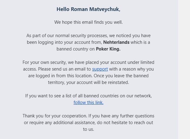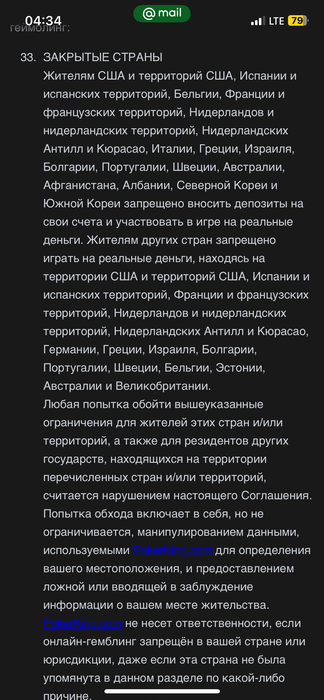 Если Poker King : В настоящее время Poker King запрещен в следующих странах: Австралия, Афганистан, Албания, Бельгия, Болгария, Голландская Вест-Индия, Эстония, Франция и Французские территории, Германия, Гуам, Греция, Израиль, Италия, Нидерланды и Нидерландские территории, Португалия, Испания и Испанские территории, Швеция, Израиль, Южная Корея, Северная Корея и США.