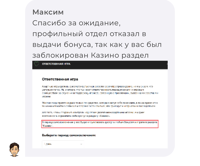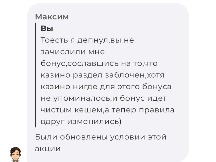 Lexuzzz @ 24.05.24Покердом, так что насчёт того бонуса, вы проверили это была ошибка или вы такие бонусы выдаете, которые невозможно отыграть в плюс, как не старайся.