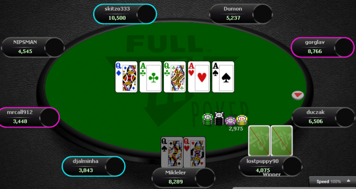 И тут опп показал, что он умеет играть преимущественно по карте. Я начал забирать банк за банком: или ловя монстра в 3бет поте, где опп избирал абсолютно пассивную линию: