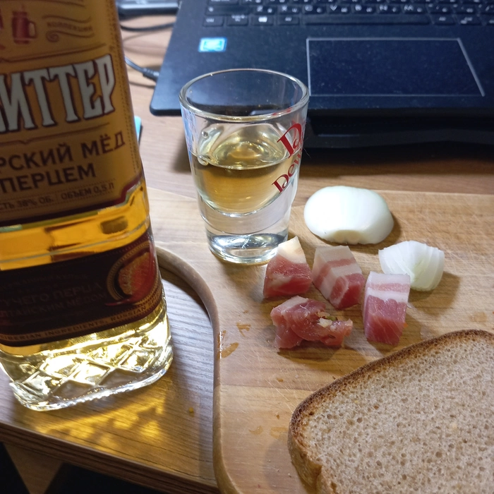 Поющие гимн бедности: сало с прослойкой, лук, чёрный нищенский хлеб, настойка всего 38% , а не богатые 40%, доска из бука, а не красного дерева.