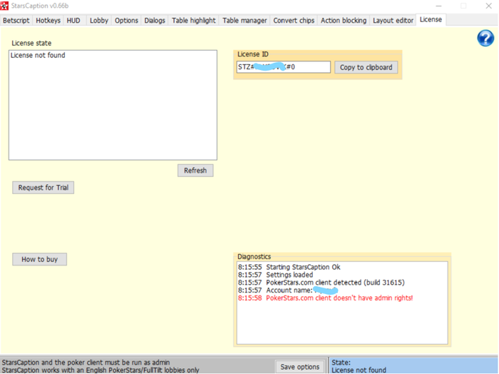 LikeAA @ 11.4.2020 Привет Либо у тебя триал не активирован, либо что-то другое с лицензией. Запусти программу, когда не открыты столы (но клиент рума при этом запущен и залогинен), посмотри состояние лицензии на вкладке License.