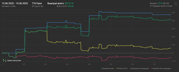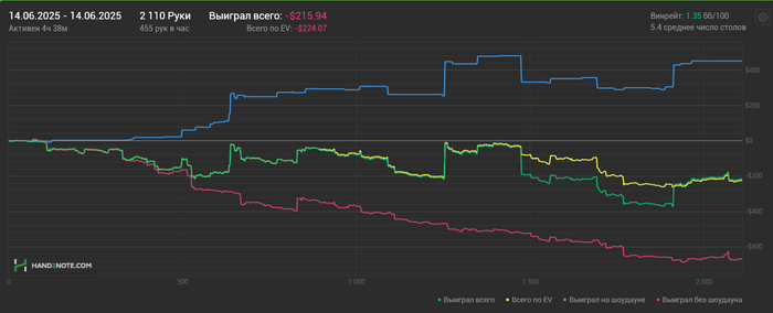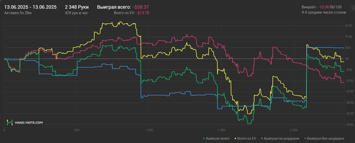 13.06.2025: 328 минут, 2348 рук, nl50-100 -$168.
