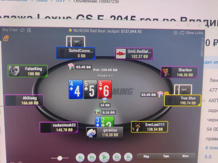 Скорее всего, это просто диспа, на 200 звёздные составы, супервипы отжигают, но выиграть не могу вообще. Хотел закончить сессию, но оставался этот вот последний кадр, он колд4бетил JTo и выставлялся на 100бб на изи, выигрывал, конечно же, через раздачу префлоп из утг ставил по 45бб. Префлоп тут он 6бб 3бетил, я ему 65бб, чтобы полстека ровно моего, он изи колл. На таком флопе поехали, у него , один борд он крутил, ему упал флаш, он сразу же свалил из-за стола после этой раздачи.