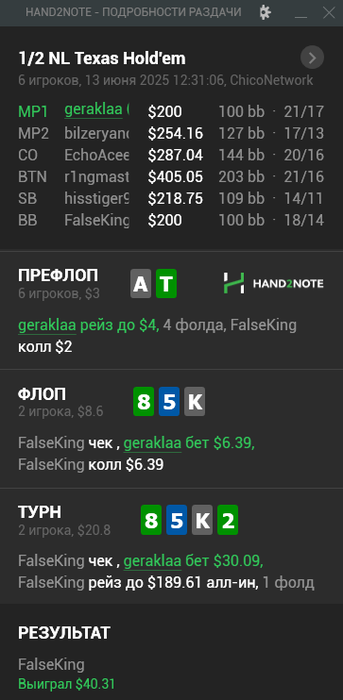Ещё вот "гениальная" раздача от 10бб/100 топрега. Ну не может там быть спектра пуша против овербета, тем более, на велью. Конечно, если он знает, что я в тильте, и отобью его по AK/KQ - то почему бы и нет. Но я не настолько в замазке сегодня был, поэтому выкинул бы АК точно так же легко, как свою руку.