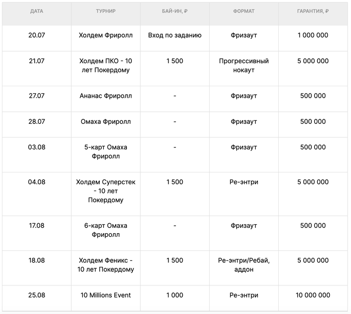 Откроет череду ивентов особенный фриролл на 1 000 000 рублей, к которому стоит подготовиться, так как в него смогут попасть только те игроки, которые с 13 по 20 июля (до 18:00 МСК) сыграют не менее 1 010 рейковых рук за любыми столами Холдема.