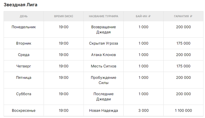rain_walker, его название Атака Клонов, так как все турниры Звёздной Лиги Покердома названы в честь фильмов вселенной Star Wars. Субъективно поляну считаю в них хорошей, а недельный лидерборд этой лиги - роскошным😏