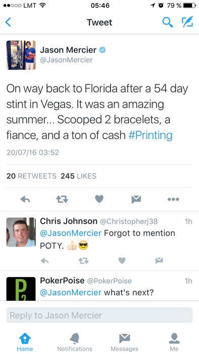 Мир Джейсона Мерсье : после 54 дней в Вегасе возвращаюсь во Флориду, это было прекрасное лето - затащил два браслета, невесту и кучу наличных #печатаю О да! У меня ещё есть небольшая доля от финалиста мейна...просто это сообщение не влезло в первый твит. Вперёд, Джерри Вонг! #вишенканаторте