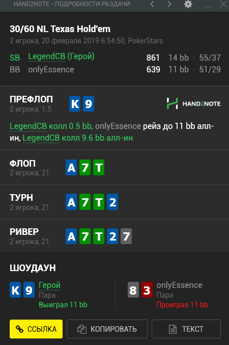 Но... Я имею в данном споте натсовый доппер. Это я уже учёл только после раздачи. В момент раздачи тупо не поверил, что рег тут так будет блефовать овербетом, больше похоже на замазывающий вэльбет, да, узко, но почему то я поверил.