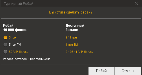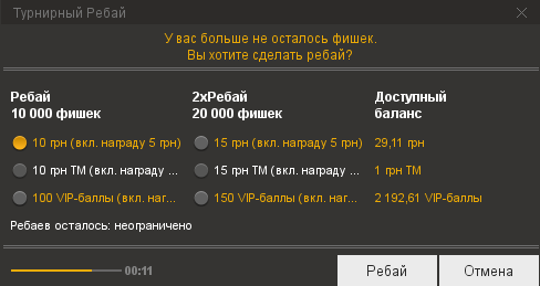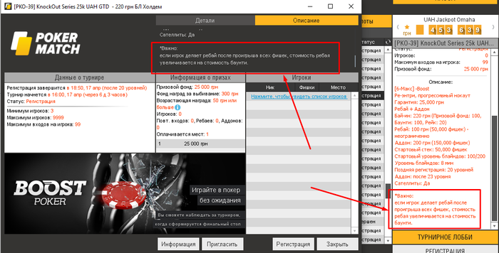 Играл в турнире PKO-02. Специально пополнил 1550 грн,чтоб играть по определенному плану: регистрация 550 + 2 ребая 250+250(если понадобиться) и аддон 500. В итоге,т.к. Я сделал 2 ребая и ничего не подозревая,т.к.информация о списывании денег не сразу обновляется,оказалось с меня списали за 2 ребая по 500 грн,т.е.1000 грн и мне не хватило,соответственно,денег для продолжения игры.И физически Я не успел пополнить. Но Я то рассчитывал на совсем другое,имея информацию о турнире.