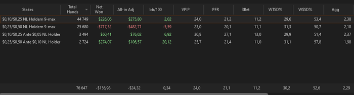 Просто в моменте перестал бить поле, еще задолго до введения анонимного лобби (это прям отдельная тема для обсуждения). Дефолт для срика: в борды не попадаю, при блефах смотрю всегда на натсы, с АА-КК собираю только крошки от ББ и СБ. При введении моих винрейтов нл25-50 в калькулятор дисперсии, шанс закатать 76к рук составляет около 2%. Так, что это вселенская несправедливость, где я в очередной раз попал в редкую ветку диспы со знаком минус, или я просто разучился играть?
