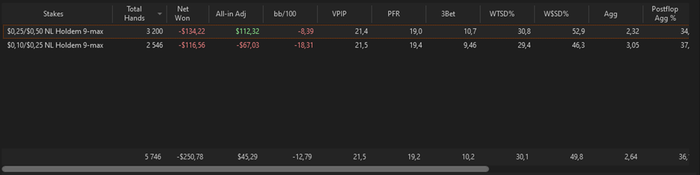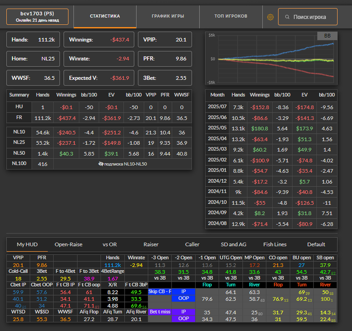 Одно знаю, что хороший игрок никогда не выкатает на нл25-50 фра 75к рук в минус. Да и -150$ в рамках лимитов за два месяца это не такая большая сумма. Но тут дело совершенно в другом, я очень тяжело переживаю такие отрезки, особенно когда они длятся не один месяц, на моей памяти — это рекорд, почти 3 месяца из 7 за год закатать в около ноль на рабочих лимитах. Да еще и анонимное лобби подливает масла в огонь, где у меня каждая сессия идет по +-5БИ за 500рук, ментальный ресурс страдает от таких качелей.