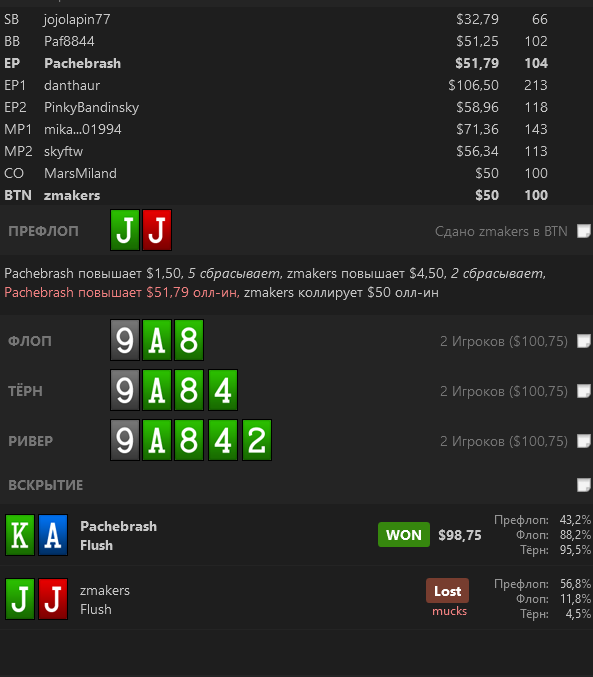 Пуш от ЕР на ФР с JJ никогда не колится, там дайбог 5бет-пуш будет 2% против которых мы едим в минус. Возможно ты видишь 3-4% и скажешь что нам коллировать по шансам т.е. ты коллируя играешь в ноль, делая фолд = ЕВ 0 но с меньшей дисперсией.