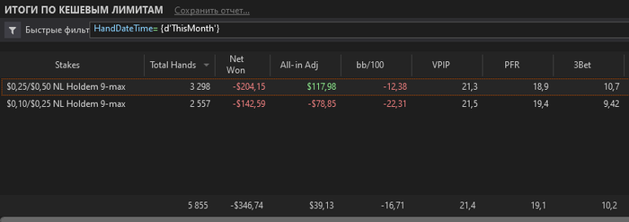 Этот месяца опять начался с ебанутых качелей, недоборы, какие-то гигасессии по -7би и обратно. Я не особо понимаю почему такая диспа. Фиши за столами есть, говнари тоже, реги все теже, но выигрывать вообще ничего не получается. Неужели увеличение кепки в 6 столов и мой стрик так меня наматывают. Самое забавное, что даже регвару и ХУ, которые я наиграл с 15 июля (время введения анонимного лобби), у меня играются в плюс.