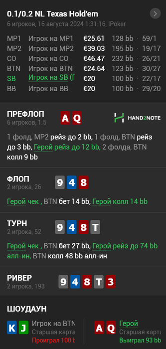 loolal1ve @ 13.08.24Whispo, Сайзинг 10 или 12 бб на смом деле сильно будут менять диап оппа, и его диап колла, должен быть меньше чем 100 комб, там из-за рейка QTs очень граничная рука, так же как и кармашки, не говоря уже о A3s и A2s. Очень странно, что солвер тебе рекомндует тут сайзинг 3/4, по ощущениям тут должен конбет диапом 25-33%, я думаю, что если ты дашь выбор солверу 1/3 или 3/4, он будет выбирать 1/3. Смотреть в солвере ветку с чеком в 2% бессмысленно. Терн можно рассмотреть пуш, но это нужно лучше оппа знать и его сайзинги, т.к я в начале подумал, что он с сетами+ по терну ставил бы больше, и от этого наш пуш будет скорее хорошим. Ну а ривер, да скорее сдаваться нужно, ну или можно самому донкнуть например 10% и выкинуть на рейз. И на самом деле более дисповая ветка тут, как ни странно чек коллы играть, чем ставить самому.