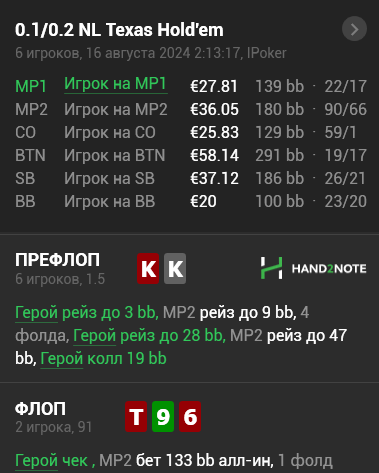 Hikaru @ 16.08.24Whispo, Для сквиза против МП слабовата рука, но уж если намотались, на таком флопе фолд!!!