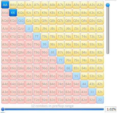 Whispo, по первой ты не ставишь оппу блефов никаких... тем более в таких позах поздних... я бы добавил AQ все, JJ и какие A5s... но даже по твоему спектру с КК у тебя 62% эквити...