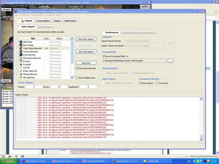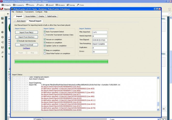 2012/01/06 21:06:34: Import complete. 0 hands in 1 file were imported. (16 errors, 0 duplicates)