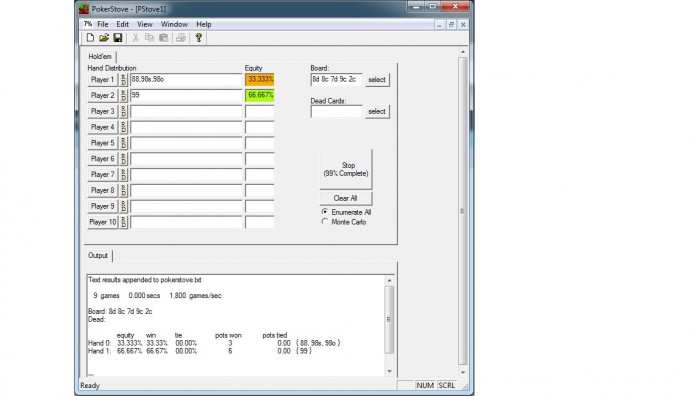 Ривер. Бинго!даже представляю как радостно заколотилось твое сердце а живот умиротворенно зажурчал! И ты как батя чекнул, что на самом деле очень плохая игра, так как флоатов тут не так много, а 55-66 и прочее он чекбекнет и ты не добраешь! Но ты таки получил бет,и зарейзил. То что пуш на велью, ты,я надеюсь, не сомневаешься? Можешь спросить у Макса, но 22 он скорее всего тут просто заколет, учитывая, насколько полярен твой рейз ривера. (уже все реги знают,что ты любитеь иногда поблефрейзить ривер!). Фактически пуш ты получаешь только от 88 и 78. унас одна комба каре и 30 % от 6 комб 87, тебе на ривере надо тащить сам посчитай сколько процентов случаев, а по математике ты их не тащишь! Я все сказал!