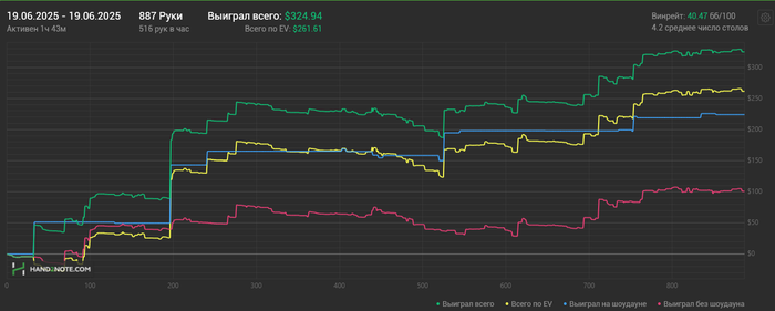 19.06.2025: 103 минут, 887 рук, nl50-200 +$509.
