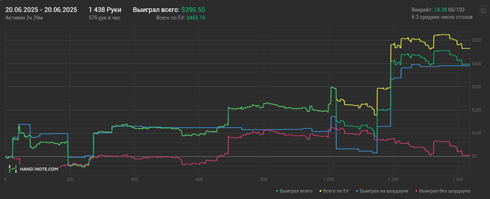 20.06.2025: 149 минут, 1448 рук, nl50-200 +$640.