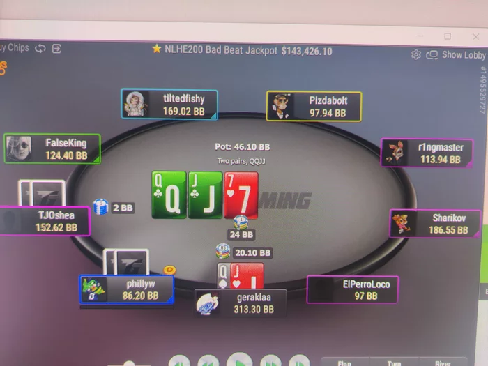 Понравилась эта раздача. Бомбпот, фишерег тут ставит мелкую с ББ первым, все падают, я в позе в дипах ставлю нормальный рейз - чел без особых раздумий жмёт колл по , и это рег nl200 😆 Я даже в тильте не сумел бы так сыграть.
