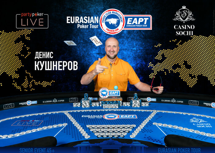 Немного магии от Дениса Кушнерова в самом конце дня. Он до того как получил карты объявил, что он в олл-ине вслепую на 15 блайндов. Глеб Ершов со стеком 9 блайндов сделал колл с . Открыли карты Кушнерова, а там ! Тузы устояли.