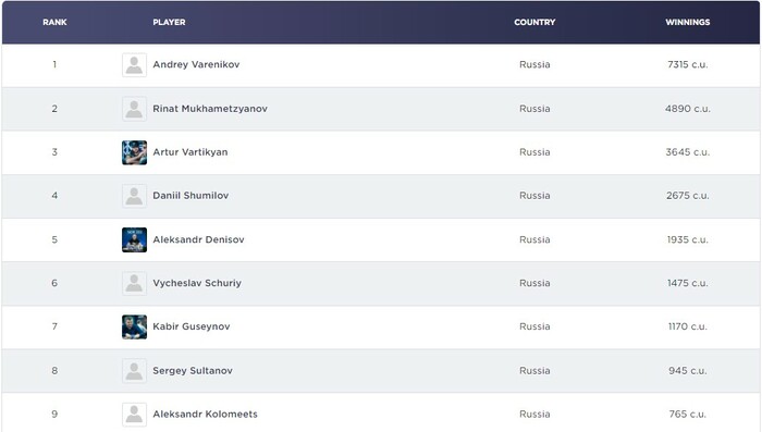 Больше всех денег выиграл Вячеслав Щурый. Именно он сорвал куш, забрав лучший баунти - 15,710. При этом он доставил также ещё один бонусный баунти на 3,940 у.е. Даже при том что финалка для него закончилась переездом, на удачу он жаловаться никак не может.