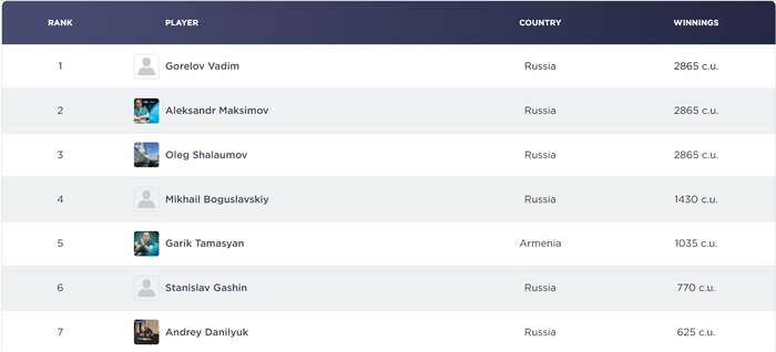 В призах будет 35 человек - минимальная выплата - 1,260 у.е. Чемпион станет богаче на 41,520 у.е., но чемпиона мы узнаем только в воскресенье. Сегодня играем конкретно до ИТМ.