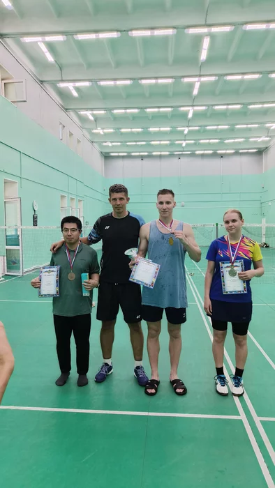 Сегодня на местных небольших соревнованиях по бадминтону с самым сильным уровнем наш кореш-мттшник Матвей взял первое в паре, затем ещё первое в одиночке. У него и так ни грамма жира нет, по фото и видно (он в центре), но он за день соревнований потерял 3кг массы тела, настолько жёстко играли, и в зале было душно, все корты он залил своим потом.