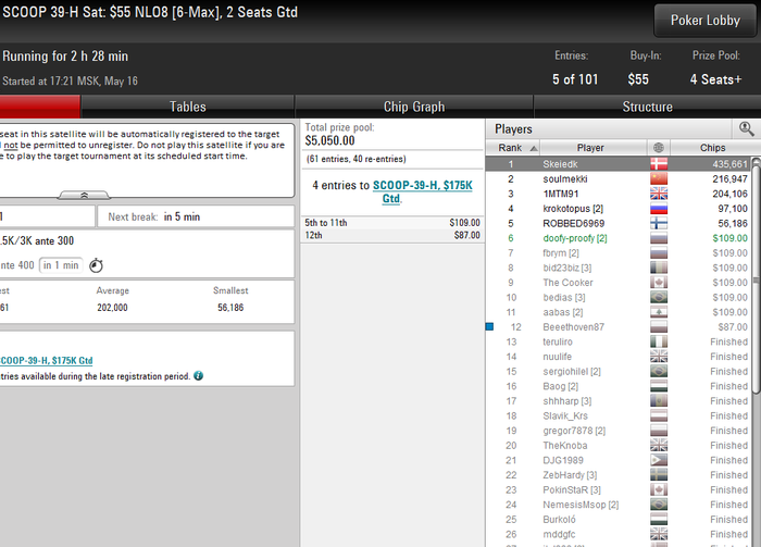 Печально, был чипаком в 4 столах, потом не складывалось как-то ..... В принципе результат неплохой, если учесть что это не моя лучшая дисциплина. Хотел финалку конечно сделать, ну не мой турнир видимо. Хотя мне игра своя понравилась. Ошибки если были, то были незначительными. Докатаем оставшиеся скупы, вдруг где-то получиться уж доехать. Всем спокойной ночи и гл. Тащите.
