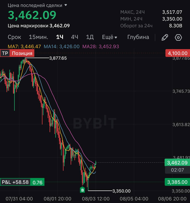 Играю на фьючерсах эфириума. Перед сном поставил заявку на лонг по $3385. Ночью приснилось, что заявка отработала, и каково было удивление, когда произошёл филигранный вход. Стоп будет в районе ~$3200-3100, нацелен на жирный добор в $4k+.