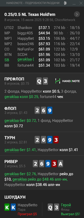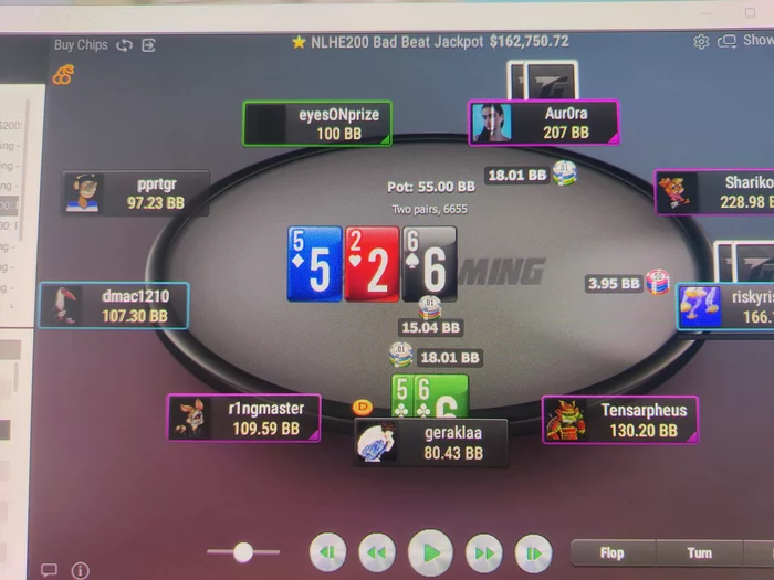Иногда, собрав силы, всё-таки седня делал отличные фолды. Тут мультипот был на человек 4-5, Аврора префлоп рейзер был. На флопе он чек, фиш ставит, я его кручу, и Аврора меня колдколит, и это в мой рендж 2пары+, иногда какие-нибудь 77-88 только может будут у меня. Вообще у него тут должны быть только 55 и 66 в теории, и пофиг, что я их блокирую, поэтому с тёрна я чек-пас планировал играть, ну и повезло, что упала спарка , даже шанса мне глупость совершить не дало гсч, выбивать оверпары возможные на спарке в мультипоте - это такое себе.