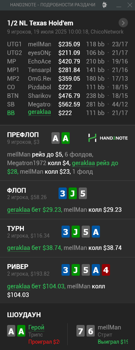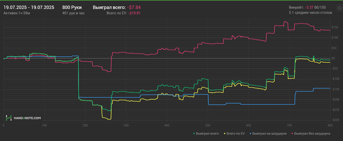 19.07.2025: 119 минут, 800 рук, nl50-200 +$108.