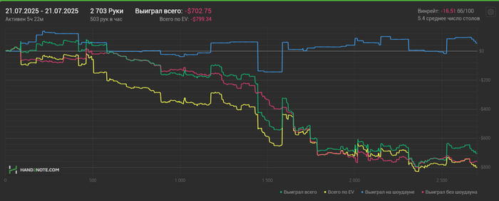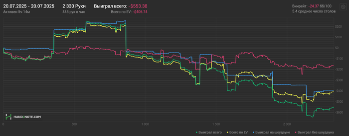 20.07.2025: 314 минут, 2330 рук, nl50-200 -$1214.