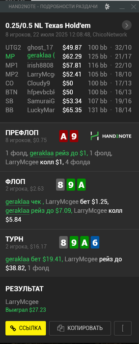 gerakla @ 22.07.25А тут уже идеальный пас был сделан, опп нитофиш 17/10, он тёрн поставил рейз 2х 77бб, оставив себе в стеке 11бб. Если бы он запушил - я бы колол, пришлось бы, а так тупо дал мне шанс отскочить, я им и воспользовался, там всегда сет+ у него.