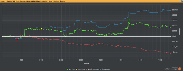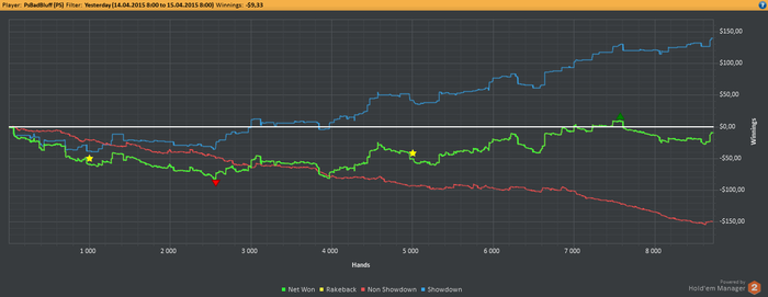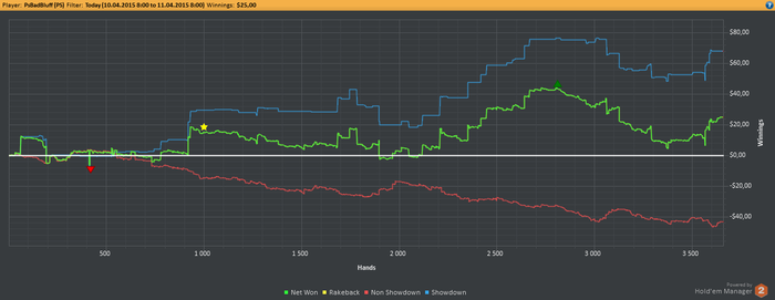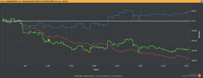 С покером знаком около 5 лет...Узнал о нем с гарены,где я задрачивал доту. И со временем мне понравилась эта игра и я начал уделять покеру больше внимания,чем доте(уже полтора года вообще в доту не играл,удалил,не востанавливая),наверное потому,что в покере я мог заработать.На гарене игра была на условные фишки,но хватало дурачков,которые их регулярно покупали и быстро заливали.Я вник в суть игры,поднялся и начал свой "бизнесс" - продавать фишки.Это было шикарно-я занимался любимым делом и получал от этого деньги,довольно нормальные по моим меркам на то время...Но вот года 2 назад лавочка прикрылась - покер на гарене убрали,и я был в недоумении что мне делать дальше.И вот решился и депнул на старсы баксов 30 может,не помню точно...Пробовал кэш,но неудачно...и как-то зарегался в турнире 1,35 КО и занял в нем 16 место,за что мне дали где-то 25 баксов и я был этому очень радНа следуйщий день я также в нем участвовал и занял 18 место...И тут меня постигла мысль что я Бог турниров,наверноеи начал их катать,подгружая HU гиперы...Погрузившись в игру,катал мтт только нокауты до 27$(иногда 54),по несколько штук в день и HU ГИПЕРЫ до 30$(рабочий лимит был 7-15)...Но дела шли не очень,я нихрена не выигрывал но и не депал....все что собиралось рейком и в HU я заливал в турнирах,удавалось также делать небольшие кешауты по пару сотен в месяц,но это было не всегда.Меня все это за*бало и я перешел в кэш. Начал с зум нл2,который я играл дней 10,за которые плюсанул где-то 150$ и самый плохой день у меня был +1$,и тут я подумал"ВОТ ЖЕ ОНО,МОЁ!!!". Дальше перешел на зум нл5,где задержался на месяцев 5!!И тут меня заебал зум окончательно.Я попробовал обычные столы нл5,потом дипы,меня апнуло с 400$ до 900$ где-то за 2 недели и я офигел,как же так получилось,и начал играть дипы нл 5.За все то время я играл без какого-либо покерного софта,не смотрел ниодного покерного вода,не читал никаких книг и статей....я просто играл в свой любимый покер и надеялся,что мне повезет. Но просто везения здесь мало.Я купил ХМ,перешел на нл10,на котором уже сижу 5 месяц, нихрена не обучаясь и мешу рейк,играя 17 столовИграю дип столы,если их мало то подключаю обычные...Короче результаты такие - Отыграл около 500к рук на нл10 с вр 1,5бб/100Делал шоты выше,где меня разрывали под тильтом и я опять возвращался на свой "любимый"нл10Благодаря платине и рб я еще на плаву. Вынужден кэшаутить каждый месяц ~250-350$ на личные расходы,ибо живу полностью на свои деньги,уже не тот возраст, чтобы меня содержали родители....стыдно просить деньги у них.