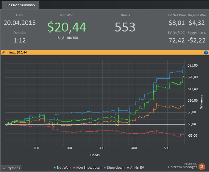 Привет, дорогой читатель! Спешу поделиться с тобой свежими наблюдениями: 1) В отпуске катается тяжелее, чем после работы. В первую очередь, потому, что ломается паттерн "пришел с работы - покатал" 2) на микролимитах глубина и интенсивность тильта такая же, как и на более высоких. То есть жесткий переезд в два аута меня так же злит, как и на мидстейкс. Наблюдения эти родились в попытке проанализировать фактические результаты и их несоответствие планируемым)) За время, прошедшее с момента публикования последнего поста с графичком, сыграл три сессии. пройдусь по ним: Первая сессия: Раздачи: добор в 150бб на ривере против фиша Poker Stars $0.01/$0.02 Pot Limit Omaha Hi - 4 players DeucesCracked Poker VideosHand History Converter