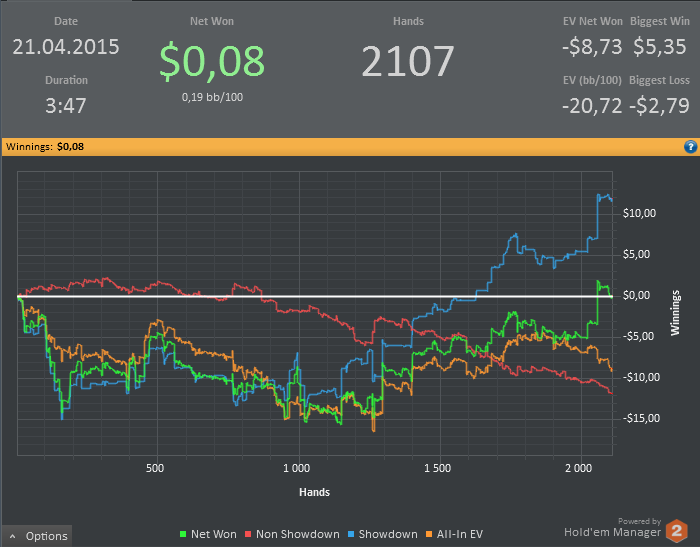 За over 10K рук получился такой результат: С банкроллом 160,13 пробую перейти на PL5. Если опускается ниже 100 - опять двойка. При ~350 - буду задумываться о переходе на десятку. Пока такие планы.